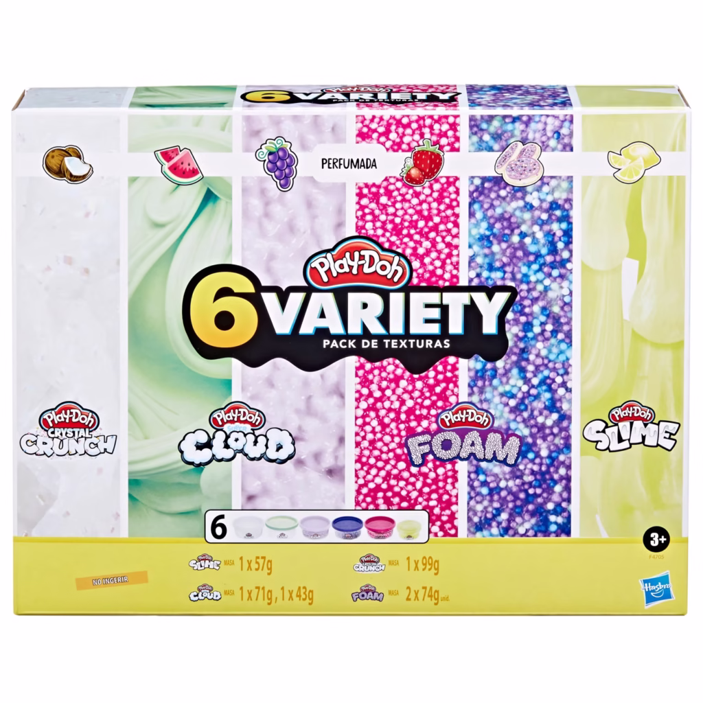 The Play-Doh 6 Variety Compounds set is designed to stimulate children’s senses through a diverse range of dough types. It includes two Super Stretch doughs with highly elastic properties, two soft Butter doughs that offer a smooth and creamy texture, Play Foam which contains appealing foam chunks for tactile contrast, and airy Cloud dough that feels incredibly light and fluffy to the touch. This variety helps develop dexterity, creativity, and sensory processing skills.